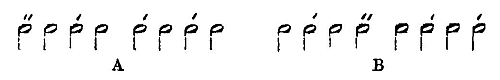 We have now learned to recognise the emotions, dispositions, and volitional processes as psychical contents, all of which differ from each other in their characteristic processes. None of them, however, contain anywhere specific elements. They can all of them be analysed into the same forms of feelings. Although the volitional process in especial is very peculiar, yet this peculiarity nowhere depends upon specific ideational or affective elements, but solely upon the mode of combination of these elements into emotions with their end stages again composed merely of general affective forms. Still there remains another question to be answered, which has not yet been settled by the reduction of all feelings to the above-mentioned six principal forms, viz. pleasure, displeasure, strain, relaxation, excitation, and quiescence. Is each of these forms perfectly uniform? Does it always return in the same quality? Or does it stand in a similar relation as the colour "blue" stands to the different shades of that colour, so that the principal form may not only appear in different grades of intensity, but also in various qualities? To answer these questions let us turn again to our metronome. It has again the advantage of illustrating our problem by means of a very simple example. Let us take two rows of beats in 4/4 time with the accents arranged differently as in A and B, obtained by the method of subjective rhythm as described above.