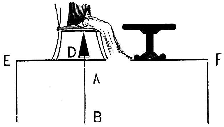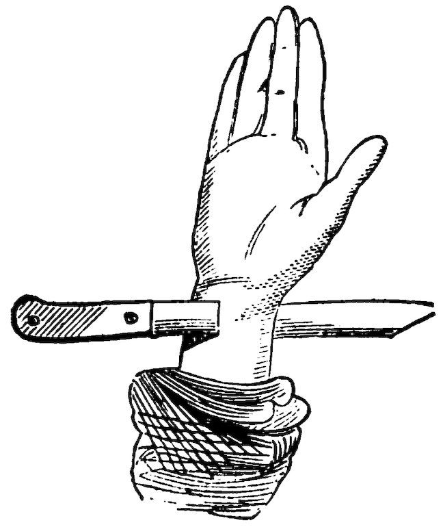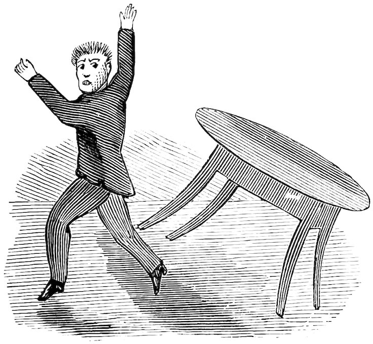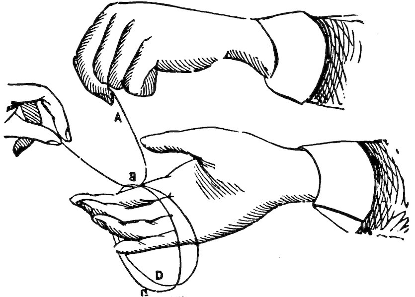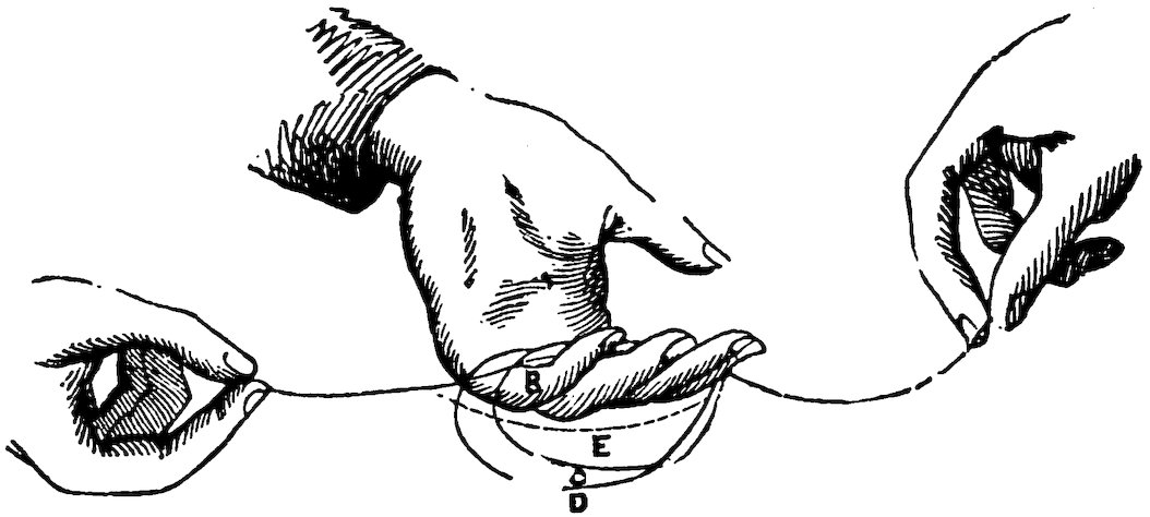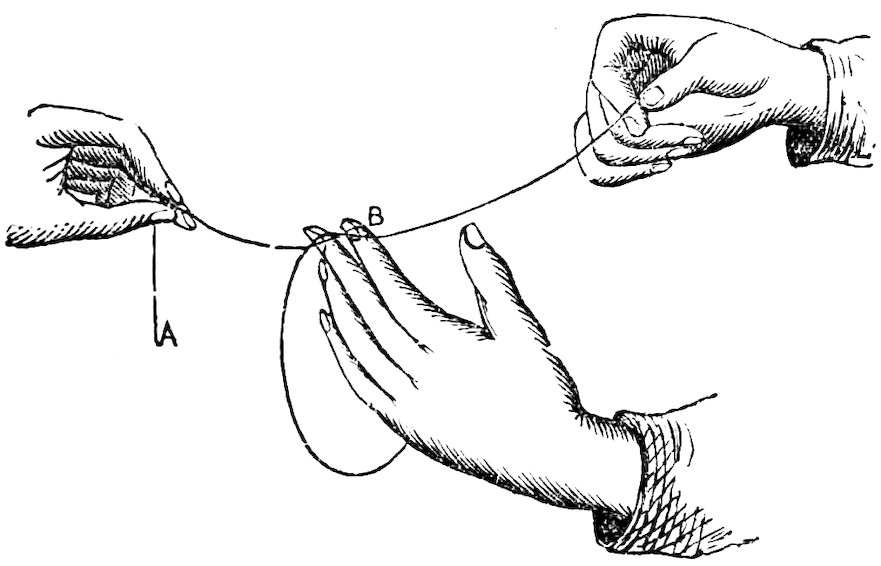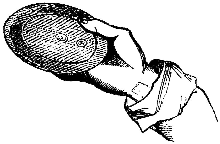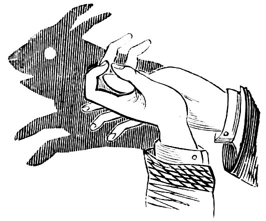 Take two pieces of white paper, about the size of a sixpence, and moisten them well on both sides. Put one on the first joint of each forefinger, just at the root of the nail, and place these fingers on the edge of the table, straight out, while the rest are closed up under the hands.