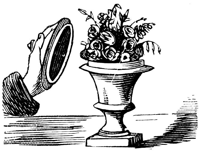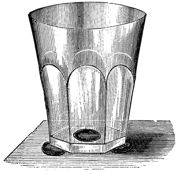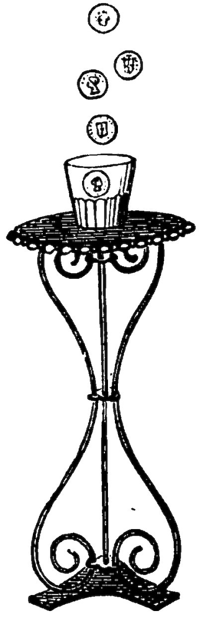 Explanation.—The bottom of the glass is of the same dimension as a half-crown. A disc of sheet-glass is cut of the same size exactly. This is substituted for the coin, and is felt within the handkerchief. When it falls, the sound is so like that of metal that all are filled with error. When the cover is removed, the water prevents the glass piece being seen at the bottom even by the operator himself.