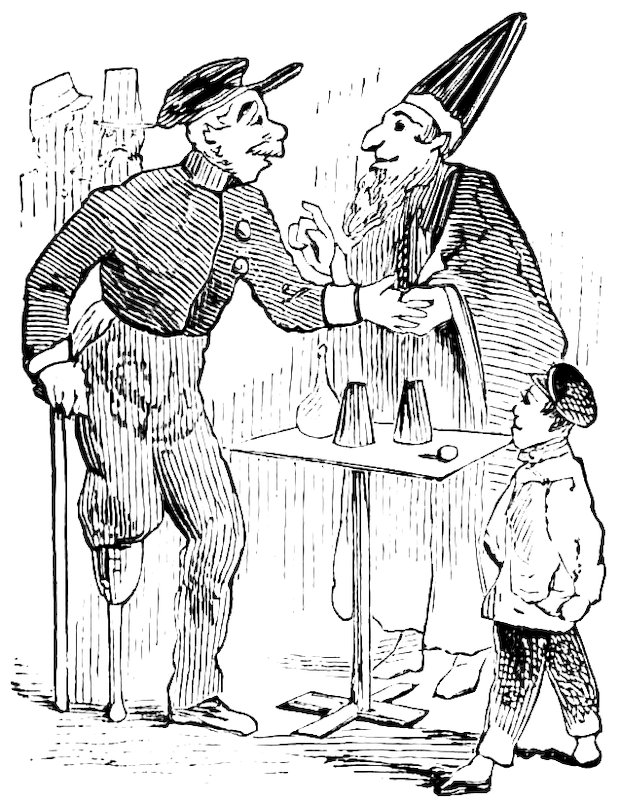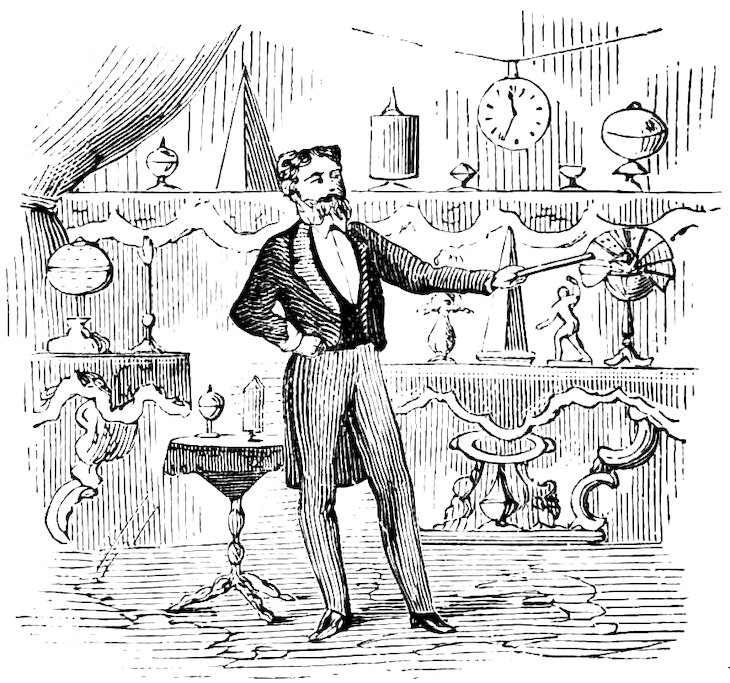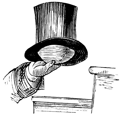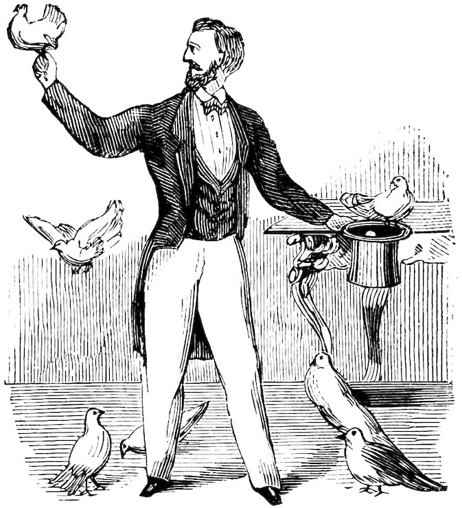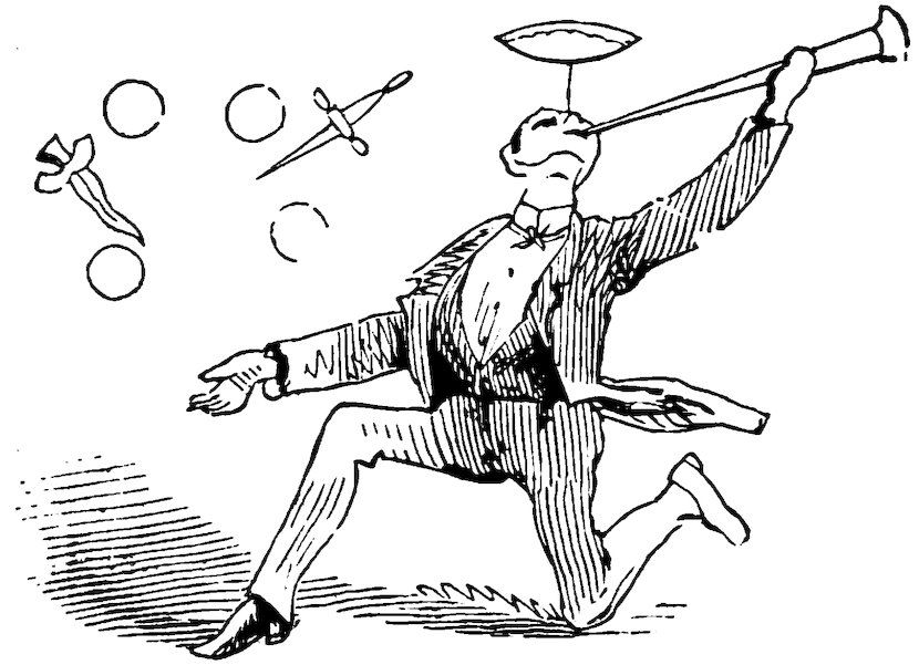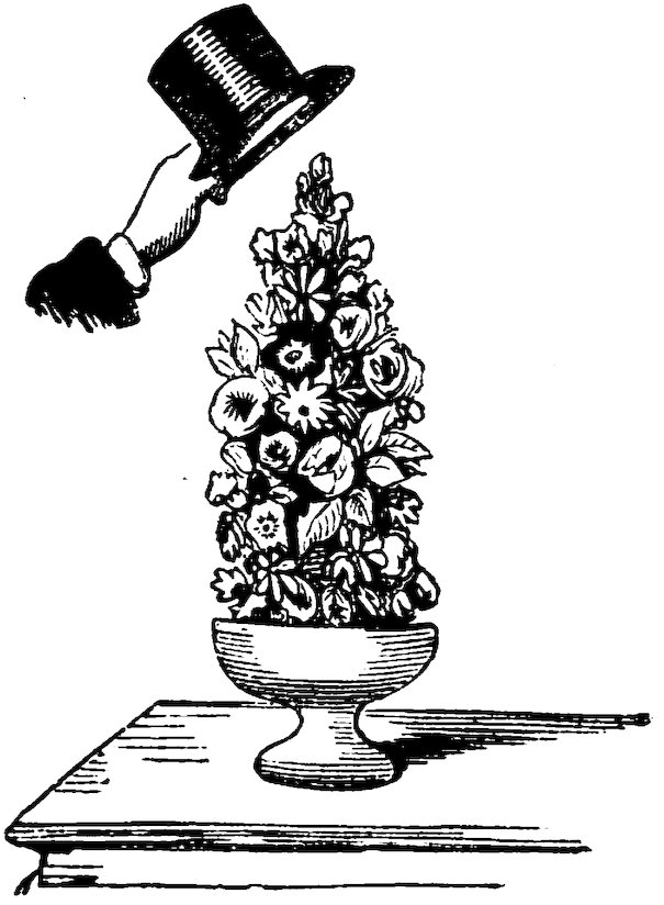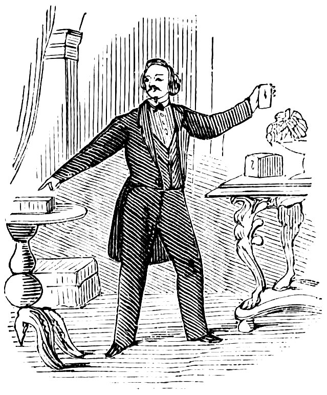 Nevertheless, Mr. Panky, with his usual assurance, announces that—without his approaching—he has the power to attract the coin to him, and, in truth, he suddenly holds it up in plain sight. The person takes away the handkerchief, and is even more astounded than the most impressionable amongst the spectators, to see nothing but the water in the glass—of which the magician relieves him by swallowing it.