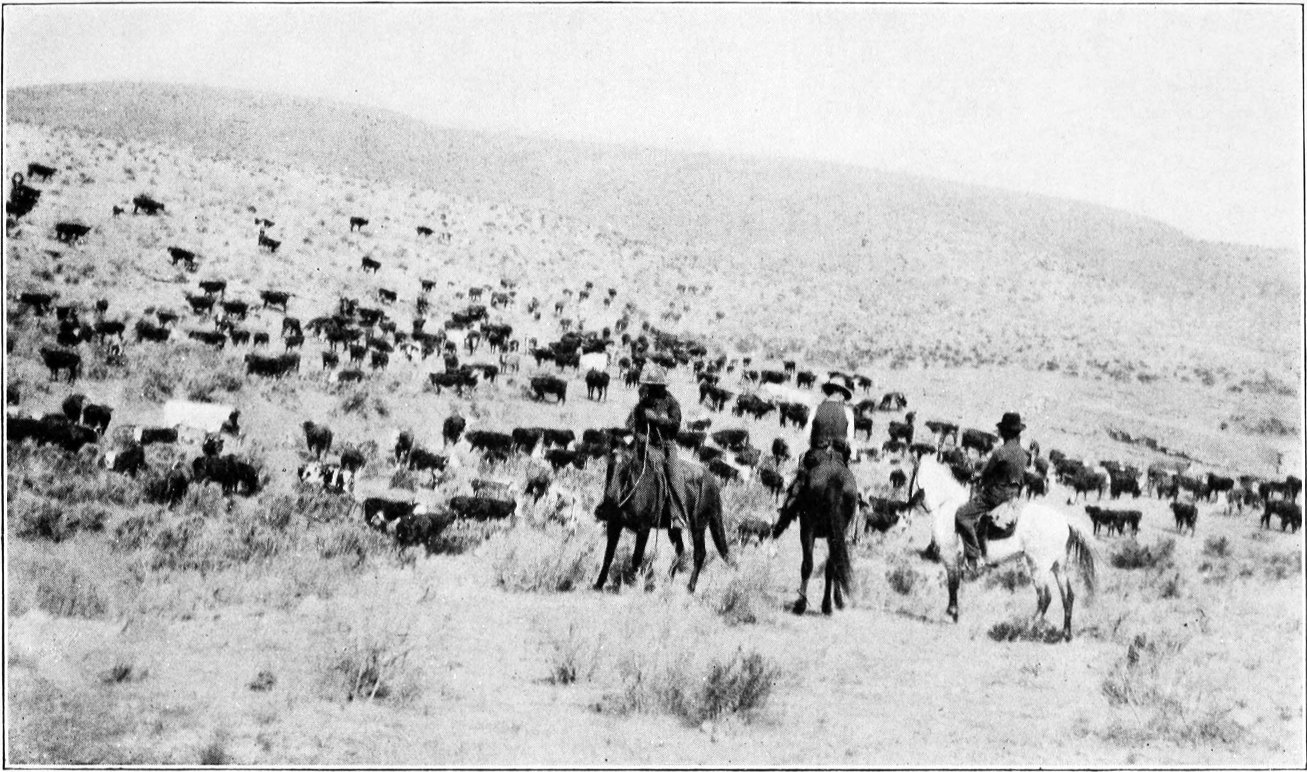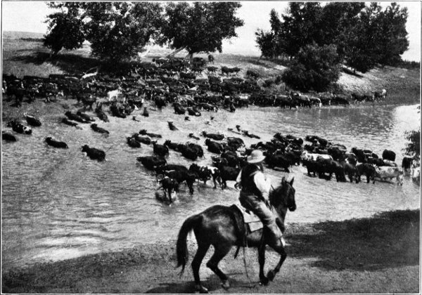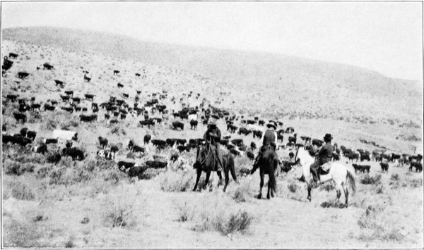 Having cut out some three hundred cows and calves, the "choppers" rode out of the herd, and the "cut" was slowly driven off to water at a near-by windmill, while the main body of cattle was allowed to drift out onto the range at their own pleasure.