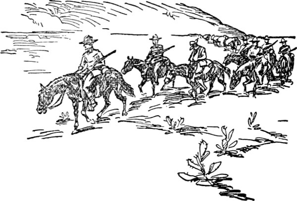 Tex and the marshal were not quite so foolhardy or ignorant as to feel that they could capture and arrest the crowd they were after, but the marshal wanted that nomination in the fall, and felt it was a good chance to make a "rep" for himself. Tex was to be his chief deputy, if elected, so he was also eager to do something to prove his valor. Their idea, therefore, was to make a sort of grandstand play, follow the boys out a ways, fire a few shots after them at parting, and come back to town. Hearing them rattle across the bridge and out over the rocky road beyond, they feared no trap or ambush, and so kept riding in their wake, firing a shot every few seconds, as much to show the townspeople what they were up to, as anything else.
