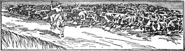 Early next morning the leaders of the roundup party, engaged in gathering up the cattle on the range, swung across the prairie in a great semicircle, sweeping before them in one huge drive, everything of the cow kind. As they divided up into couples to work down the country, the leader said: "Bill, you look out an' catch that ole blue-roan we seen yistiday. The old man wants all them cows to throw into that Arizony drive, an' her an' the calf will make it in all right, I reckon."