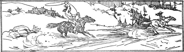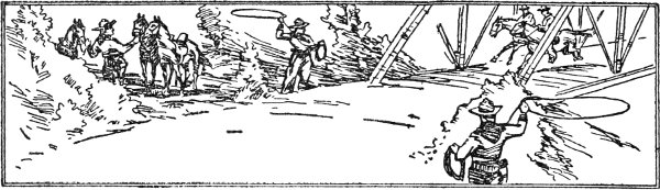 Now, the four men on the bridge were the most skillful rope-tossers in all that range. Rope-tossers, instead of swinging the rope around their heads before throwing, spread it out behind and to one side of them, and with a quick, graceful throw, or toss, launch it with unerring aim over the head of the animal at which they throw. This method is used almost entirely in catching horses out of the "cavyyard," and also in catching calves out of a herd, as it is done so quietly and easily that the animal is snared before it has a chance to dodge or move.