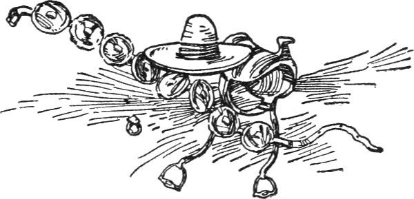 Baldy jerked his pony up on its haunches, and carefully examined the cylinder. Sure enough every shell was there, but empty. Jack Gibson, who had followed Baldy, had the same luck, and when the rest came up a general investigation followed. It did not take them long to see that they had been tricked by some one. Their indignation knew no bounds. "Jes to think," said Big Pete, "s'posin' one of us ud a got inter a row, and some blame town galoot had a drawed a gun on him, wouldn't he 'a' been in a fine ole fix to 'a' jerked his 'hog-leg,' and nary a bean in the wheel?"