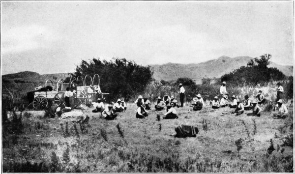 One fine morning about four o'clock the cook, who had been up in the cool morning air since half-past two, awoke the sleepers about his wagon with a long "roll out, roll out, r-o-l-l-o-u-t" which brought the sleepers in the camp beds scattered about the wagon to the campfire in short order.