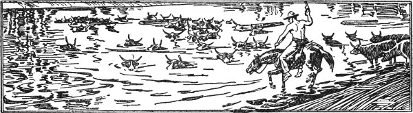 One night as the crew sat about the campfire with the herd resting quietly not far from the wagon, the wagon boss said to one of the boys near him: "Jim, I wish you'd take your hoss in the mawnin' and go ahead and see how the river is. We got to cross it before long and I'm afeard it's going to be pretty high, if all them clouds up toward the head is good for anything."