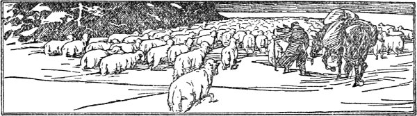 Suddenly he straightened up in his saddle and rubbed his eyes. "Say, Bill," he called, "is that a bunch of sheep there, or are my eyes fooling me?" Before Bill could reply a dog barked and came racing toward them.