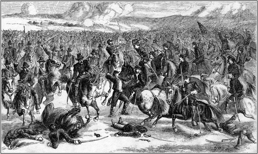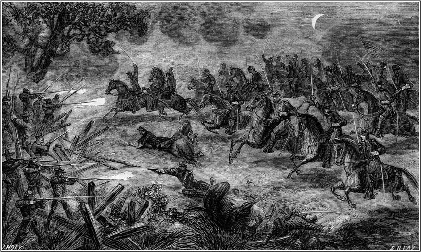 [Pg 328]This was a situation to try the stoutest hearts. Nothing daunted, however, by this terrific array of the enemy, Kilpatrick displayed that decision and daring which have ever characterized him as a great cavalry leader, and he proved himself worthy of the brave men who compose his command. His preparation for the grand charge was soon completed. Forming his division into three lines of battle, he assigned the right to Davies, the left to Custer, and, placing himself with Pleasonton in the centre, he advanced with unwavering determination to the contest. Having approached to within a few yards of the enemy's lines on his front, he ordered his band to strike up a national air, to whose spirit-stirring strains was joined the blast of scores of bugles ringing forth the charge.