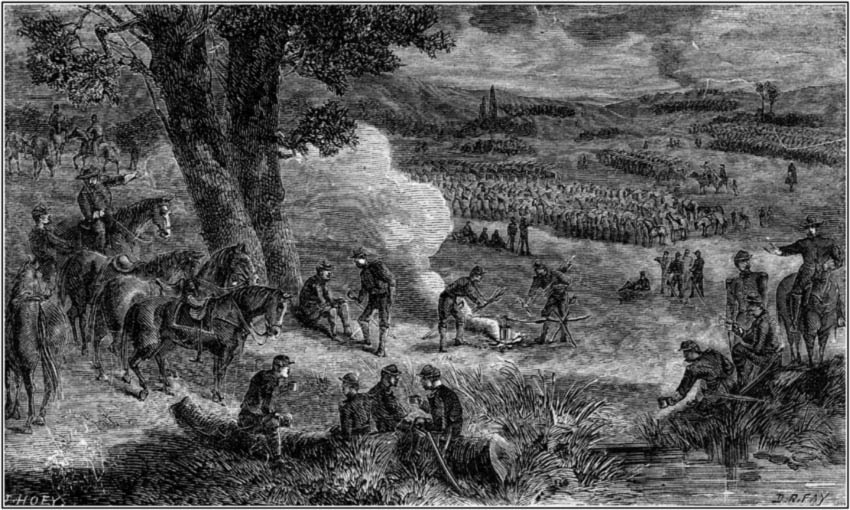 Early in the morning of October tenth the enemy, in heavy force, came down upon our pickets along the Robertson River, driving us back in haste and occupying the fords. The flank movement of General Lee was fully understood. He had crossed the Rapidan, advanced to Madison Court House, and was lapping around our right wing, threatening it with destruction. Quick work on our part was now necessary. Swift messengers from officers high in command brought orders to retire with promptness, but in good order, if possible. Our boys, in many instances, were compelled to leave uneaten and even untasted their palatable preparations for breakfast of roast lamb, sweet potatoes, fine wheat bread, milk [Pg 326]and honey, &c., to attend to the stern and always unpleasant duties of a retreat, with the enemy pressing very closely upon us.