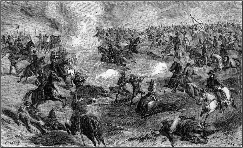 By the sudden evolution of the command, when the order was first executed, the Harris Light, which was in front, while advancing, was thrown in the rear, and was thus compelled to meet the desperate charges of the enemy in pursuit, and to defend itself as best it could from fire on the flank. Having reached a slight elevation of ground in the road, we made a stand, and for some time checked the advancing columns of the Rebels by pouring into their ranks rapid and deadly volleys from our carbines and revolvers. Stuart, who commanded in person, saw clearly that the quickest and almost only way to dislodge us was by charging upon us, and, consequently ordering the [Pg 338]charge, he came with a whole brigade amid deafening yells. Our men stood firmly, almost like rocks before the surging sea. We were soon engaged in a fierce hand-to-hand conflict with the advancing columns.