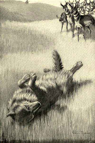 "Well, it was this way: Once upon a time, in the low hills they call Cypress, I was stalking a herd of antelope. To tell you the truth, I had been at it for two days. Waugh! but they were wary. At last I worked within fair eyesight of them, and knowing the stupid desire they have to look close at anything that may be strange to them, I took to myself a clever plan. Lying on my back as though I were dead, I held my tail straight up, and let the wind blow it [Pg 7] back and forth. The big-eyed Eaters-of-Grass asked one another: 'What is this new thing? Is it a plant or an animal?' That is the way they talked, I am sure, for they are like wolf-pups, quite silly. Well, they came closer and closer and closer. E-u-h-h, e-u-h-h! but my mouth watered with the thought of their sweet meat as I lay as one dead. Now, they hadn't the knowledge to work up wind to me, but came straight for the thing they saw that moved. Would you believe it, just as I was measuring from the corner of my eye the time for a strong rush, who should creep over a hill but Camous! In fright I sprang to my feet, and away went the Goat-faced small-prongs. Then the deviltry of the many-breathed Fire-stick this Camous carries came down upon me as I ran faster than I'd ever gone [Pg 8] before. 'Click, snap! click, snap!' the quick-breathing Fire-stick coughed; and though I rocked, and jumped sideways and twisted, before I could get away I had one of the breath-stings in my shoulder. E-u-h-h! but I go lame from it still."
