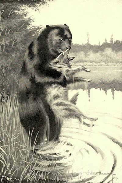 Very close to A'tim the huge Wolf sat while his two Sons searched the opposite bank for the coming out of Shag. Soon a "Hi, yi—he, he, he-voh-ooh!" came floating dismally up the tortuous stretch of winding stream. "Come; they have found it," said the Wolf.