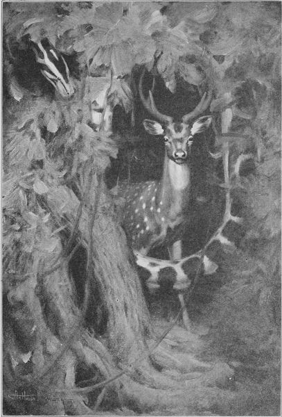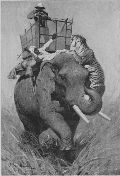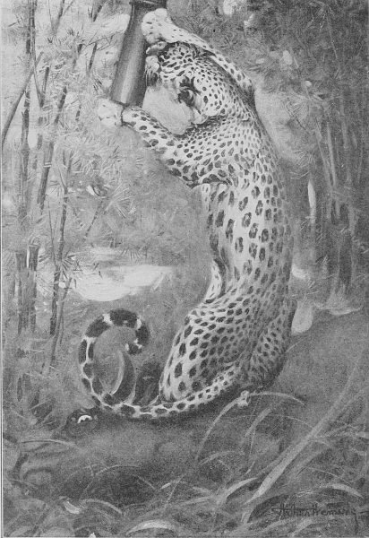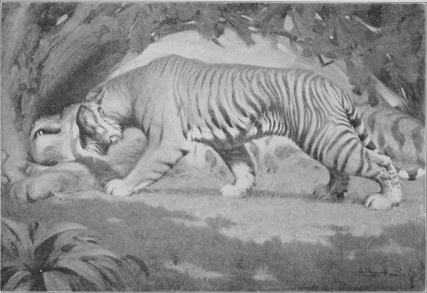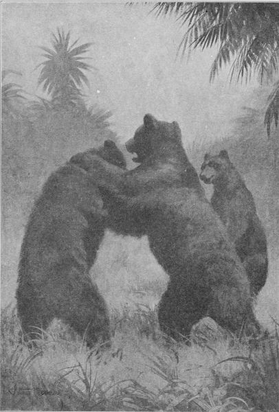 "They wouldn't go away," said Sa'-zada, "and I began to fear that I shouldn't get a shot at Stripes. I did not want to shoot, because if Tiger was anywhere in the neighborhood it would put an end to his visit. I had nothing heavy to throw at them except my water-bottle; but, finally, taking a long drink to keep the thirst away for a time, I[Pg 230] stood up in the machan and let fly the bottle. It caught the Bear just behind the ear, and Bhalu, thinking one of his comrades had hurt him, pitched into the other two, and there was a fierce three-cornered fight on in a minute."