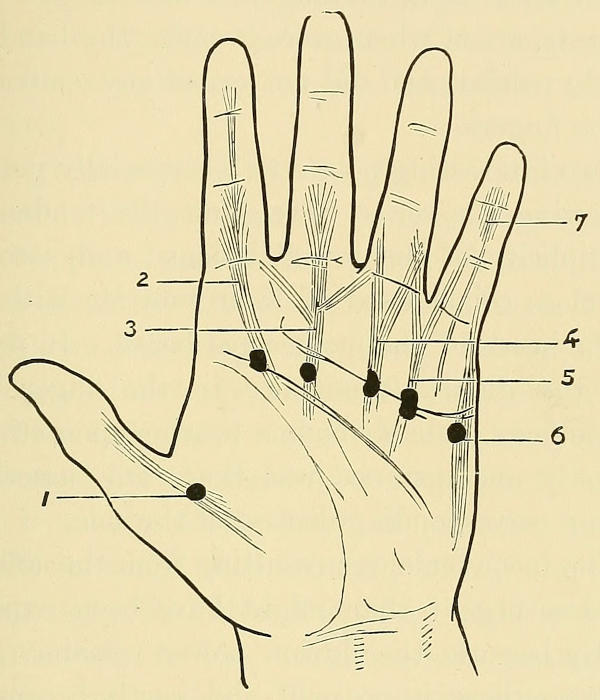 Diagram showing the various types of the abnormal bands in Dupuytren’s contraction. The position of the initial lesions over the heads of the metacarpal bones and opposite the flexion lines is indicated by the black spots. 1. Thenar band; 2. Axial band extending to distal joint; 3. Axial band giving off lateral branches to adjoining fingers; 4. Axial band bifurcating to send branches to sides of finger; 5. “Interosseous” band bifurcating to join two adjacent digits; 6. Hypothenar band; 7. Band more developed at distal than at proximal extremity, and leading to contraction of first or second inter-phalangeal joint, the metacarpo-phalangeal joint remaining free.