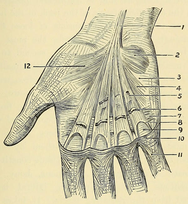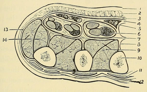 1. Palmar integument; 2. Fat transversed by fibres from 3; 3. Radiating fascia; 4. Vaginal fascia, superficial portion; 5. Palmar vessels and nerve; 6. Flexor tendons and lumbricales; 7. Vaginal sheath blending with fascia of interossei; 8. Septal fibres from vaginal fascia to bone; 9. Interossei; 10. Middle metacarpal bone; 11. Extensor tendon and sheath; 12. Superficial fascia beneath dorsal integument; 13. Fascia of hypothenar eminence; 14. Muscles of little finger.