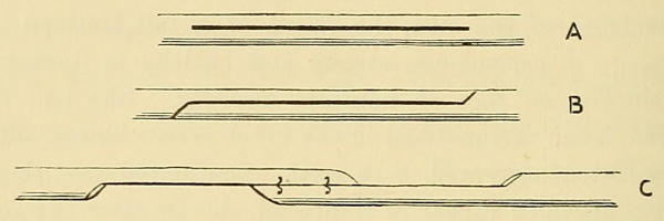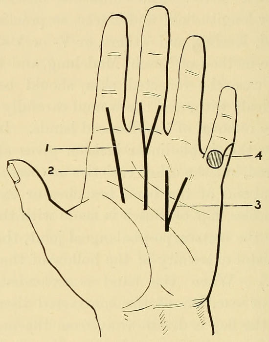 This is the more ordinary course, but the signs show great variety in different cases. 1. The disease may remain limited to the palm, not giving rise to flexion of the finger; this is especially frequent in women. 2. Any or all of the fingers may be attacked, and the rigid bands may implicate also the thenar and hypothenar eminences. 3. Either or both inter-phalangeal joints may become flexed, while the metacarpo-phalangeal joint remains free. 4. The palmar cord may remain single and central, or it may send off a lateral branch on either or both sides in the inter-digital web, and so implicate two or three fingers. 5. A central band, after reaching the root of the finger, may bifurcate, sending a branch to either[8] side of the digit; this, in my experience, is the least common variety. 6. The cord, instead of running along the central axis of the finger, may pass towards the inter-digital cleft and then divide, giving branches to two digits; a band of this kind would be in dangerous relation to the digital vessels and nerves in the event of operation by excision. (Fig. 1.)