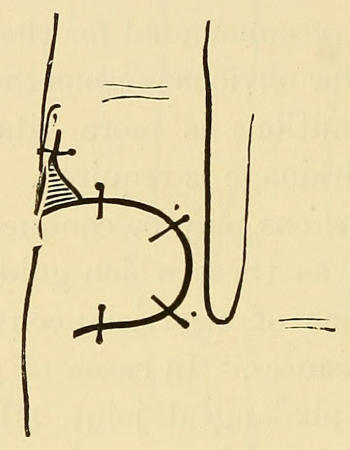 Plastic operations may be conducted under the same principles as those which guide the surgeon in the treatment of cicatricial contractions from burns or other causes. In cases of contraction at the metacarpo-phalangeal joint, where the skin is greatly involved, I have made a transverse incision through the integument and fibrous cord at the root of the finger and filled up the wide gap left on extending the joint by the transplantation of a flap from the side of the digit. (Fig. 5.) The dissection of the flap must be carefully conducted in order to avoid injury to the digital nerves. The result is usually good and permanent. In some cases it might be permissible to carry the plastic principle still further by the transplantation of a flap on the Tagliacotian principle from the chest or upper arm or any other convenient point; or the more simple resource of grafting, after the manner of Thiersch, may be employed with advantage,[40] as it has been proved to have a remarkable effect in lessening cicatricial contraction.