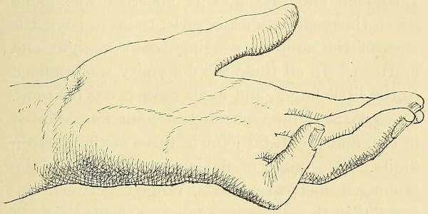 False Dupuytren’s contraction.—There is a[30] form of digital contraction usually classed with that just described, but differing from it in origin and several other respects. It is always due to obvious traumatisms, such as incised or lacerated wounds, involving the palmar or digital fascia. The age at which the lesion begins is governed by the period of injury, and hence the condition is as common in childhood and early adult life as in middle or old age. The seat of initial lesion is single, and the affection is confined to the injured hand, not tending to appear subsequently in other parts of the same hand or in the opposite member, as in most examples of the ordinary form. The contraction progresses rapidly to a certain point, and then ceases to get worse. It rarely becomes so strongly marked as in the worst cases of the true Dupuytren’s disease. The contracted band, starting from the point of injury (which is indicated by an ordinary scar) has seldom the tendon-like form of the well-marked “Dupuytren,” the characteristic puckers in the skin are represented only by ordinary cicatricial adhesions, and the digital extensions are usually in the form of one or two lateral bands following the bifurcation of the digital process of the radiating fascia. Lastly, the effect of operation is different. Subcutaneous division is less efficacious when the skin is extensively implicated in the cicatrix, and the excision of the band or the transplantation of a flap after division of the cicatrix is not followed by[31] the strong tendency to recurrence observable after similar proceedings in the true form. In all the seven cases in my list the nature and traumatic origin of the disease could be recognised without difficulty.