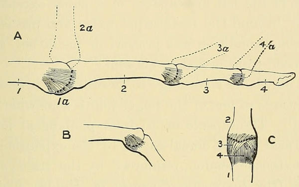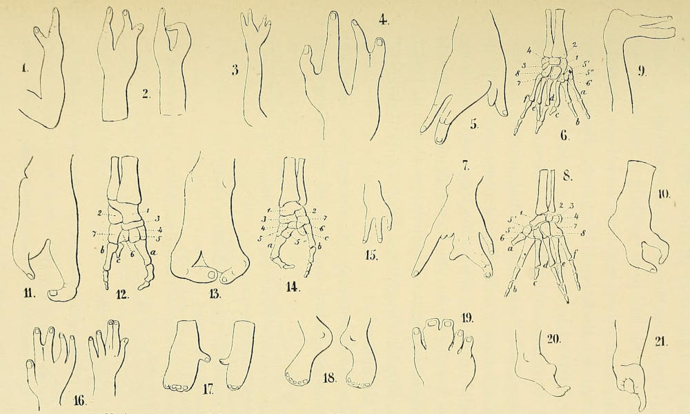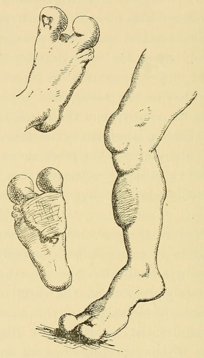 There is a material advantage to be gained by studying the deformities of the hands together with those of the feet, for it will be found that nearly all the forms of contraction that appear in the one are represented in the other, and a comparison of the conditions under which the two sets of affections arise may throw light upon the pathogeny of both. At the same time, if we glance at the structural and functional differences[2] in the hand and foot, and at the fact that civilised life imposes artificial restraints upon the freedom of action of the one, while it cultivates to a marvellous degree of perfection the variety and precision of movement in the other, we shall understand that although certain deformities of the fingers may have a strict pathological analogy with those of the toes, the effects produced, and the treatment required may differ essentially in the two sets of cases.