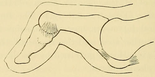 The inconveniences resulting from the affection are less urgent than might have been expected, partly because the flexion power remains, partly because there is no pain, and partly because the contraction seldom attains an aggravated form until an age when æsthetic considerations are of minor importance and the more active period of working life is drawing to a close. In some extreme cases, however, the nail of the contracted finger may press against the palm, and cause ulceration, and in one instance brought under my notice by a friend the deformity was nearly the cause of a fatal accident, the bent finger becoming hooked in the handle of a moving railway carriage in such a[11] manner that it could not be disengaged. The patient saved himself by seizing a pillar, while the traction force tore asunder the diseased fibrous bands and set the straightened finger free. It is needless to say that the benefit of the impromptu operation was limited to the immediate service rendered.