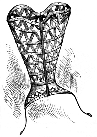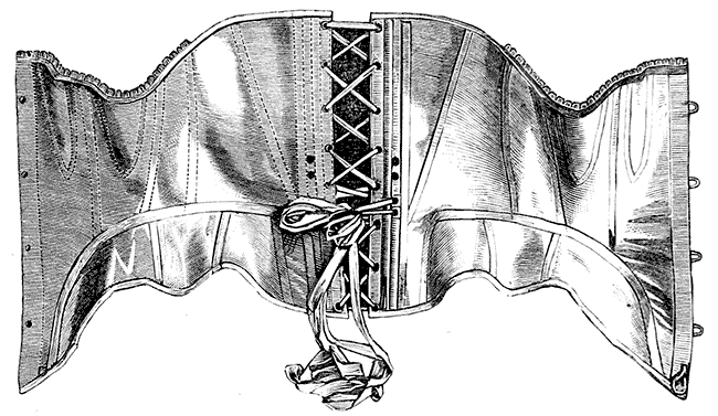 Such being the case, it becomes a matter of considerable importance to discover by what means the desirable end can be acquired without injury to the health of those whose forms are being restrained and moulded into proportions generally accepted as graceful, by the use and influence of the Corset. It will be our duty to lay before the reader the strictures of authors, ancient and modern, on this article of dress, and it will be seen that the animadversions of former writers greatly exceed modern censures, both in number and fierceness of condemnation. This difference probably arises from the fact of Corsets of the most unyielding and stubborn character being universally made use of at the time the severest attacks were made upon them; and there can be no reasonable doubt that much which was written in their condemnation had some truth in it, although accompanied by a vast deal of fanciful exaggeration. It would also be not stating the whole of the case if we omitted here to note that modern authors, who launch sweeping anathemas on the very stays by the aid of which their wives and daughters are made presentable in society, almost invariably quote largely from scribes of ancient date, and say little or nothing, of their own knowledge. On the other hand, it will be seen that those writing in praise of the moderate use of Corsets take their facts, experiences, and grounds of argument from the every-day life and general custom of the present period.
