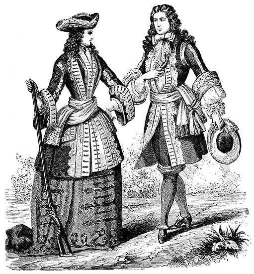 - Louis XIV. of France, the court of, high-heeled shoes, slender waists, and fancy costumes, fashionable at, 98.
