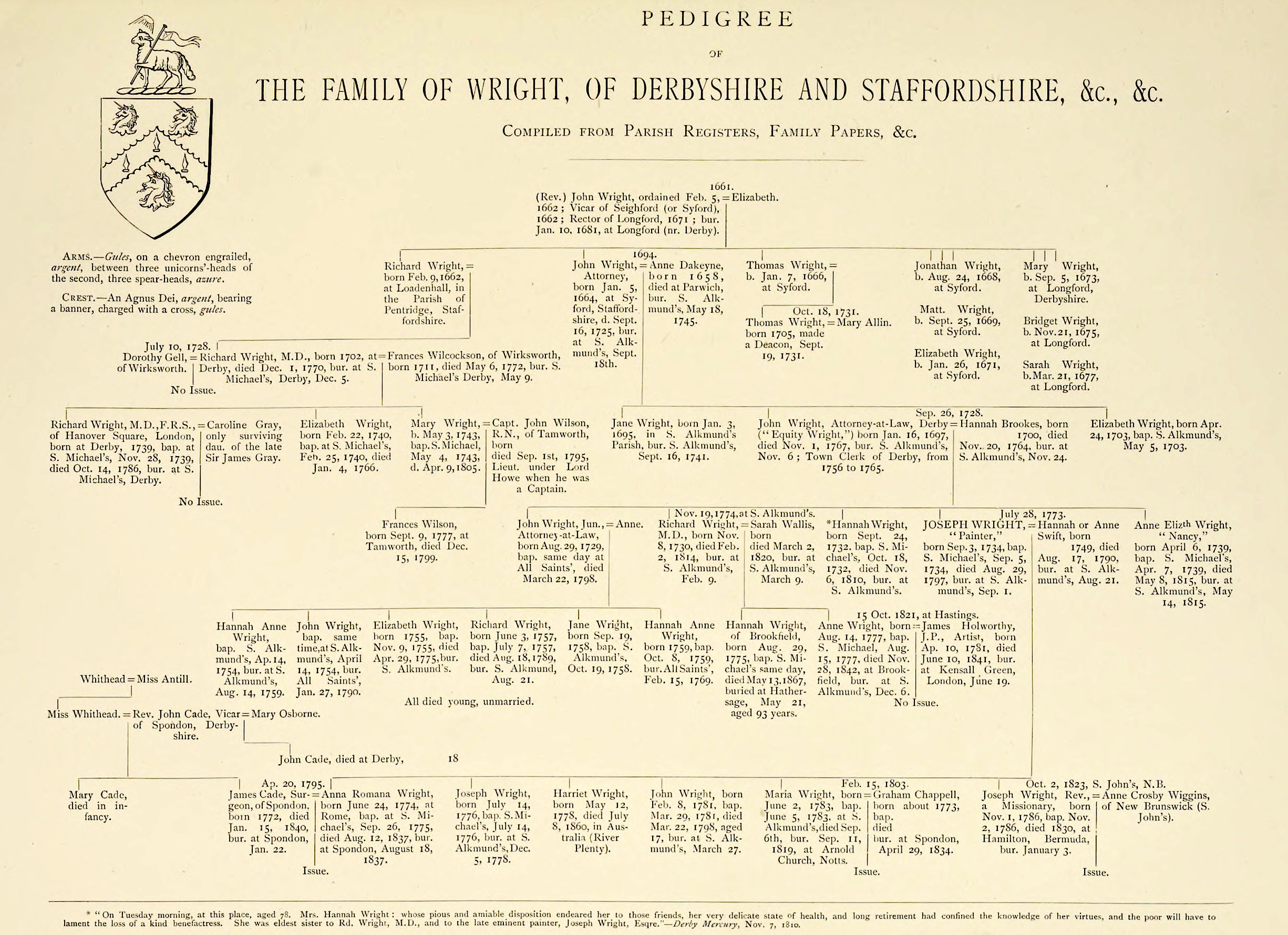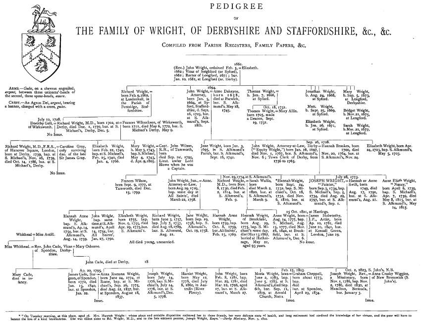 Of the nine children of the Rev. John Wright, of Seighford and Longford, some information is given in the pedigree; but here we need concern ourselves only with his sons, Richard and John, from whom sprang two distinct branches of the family. It is from John that the subject of our biography is descended, but Richard claims precedence by right of seniority.