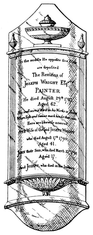 [2] “On Tuesday morning, at this place, aged 78, Mrs. Hannah Wright: whose pious and amiable disposition endeared her to those friends, her very delicate state of health, and long retirement had confined the knowledge of her virtues, and the poor will have to lament the loss of a kind benefactress. She was eldest sister to R.J. Wright, M.D., and to the late eminent painter, Joseph Wright, Esqre.”—Derby Mercury, Nov. 7, 1810.