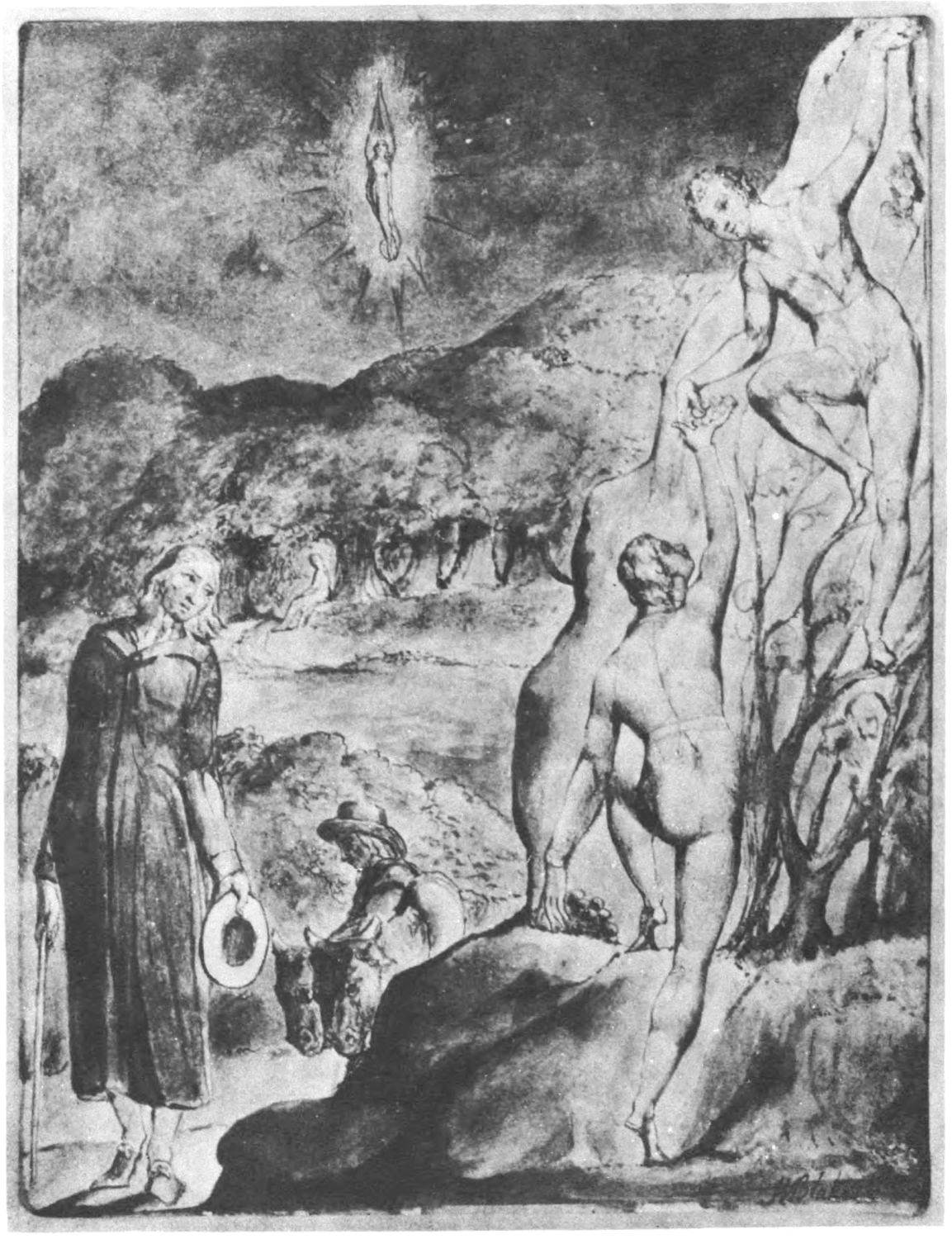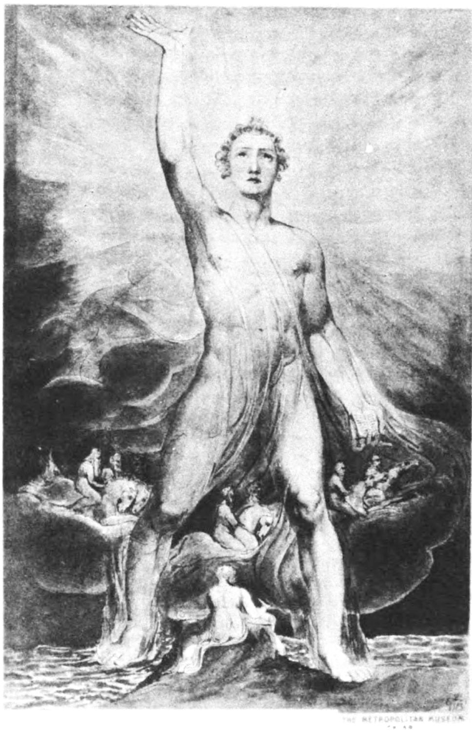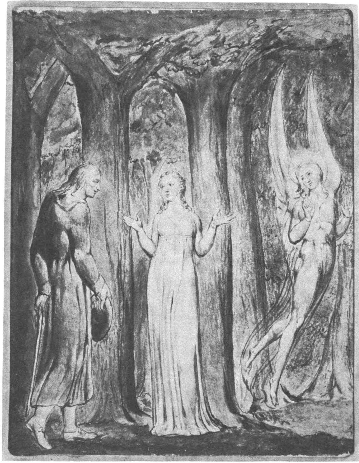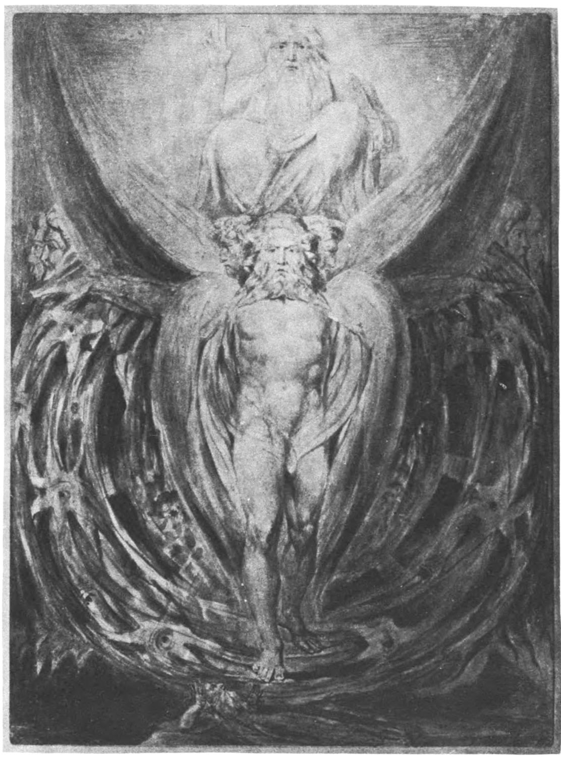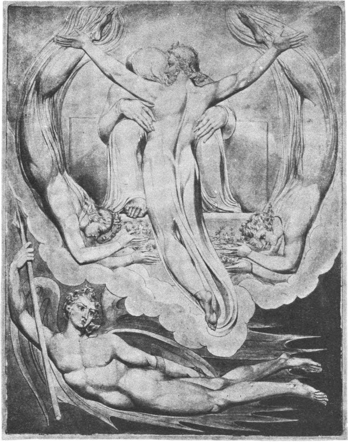 William Blake was born in London in 1757, and in 1827 he departed for “that undiscovered country” which all his life he had wished to see. Throughout the century which has passed since Blake’s death, much has been written about him. During the past few years a goodly number of our greatest men of letters have issued books on his life, art, and writings. Many of his writings have gone through several editions, but it was only within the past year that his complete works were issued, and that in a limited edition, which was soon off the market. While from time to time volumes of reproductions of a part of Blake’s masterly engravings and drawings have been issued, a large portion of his finest creations, including the “Paradise Lost” series, has not been accessible in reproductions.