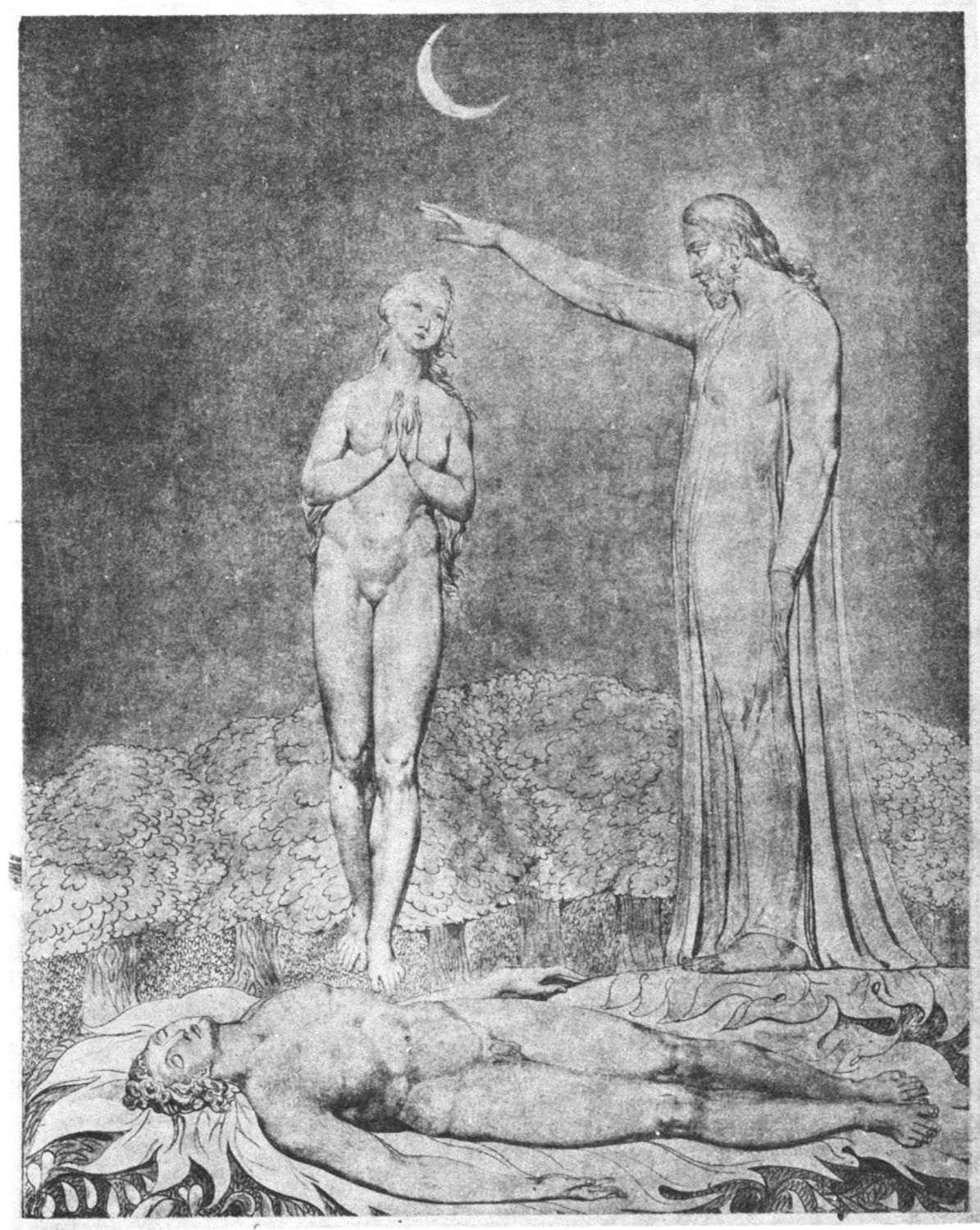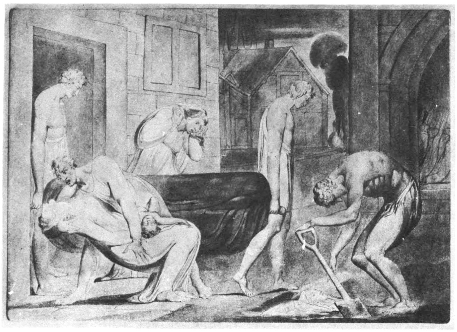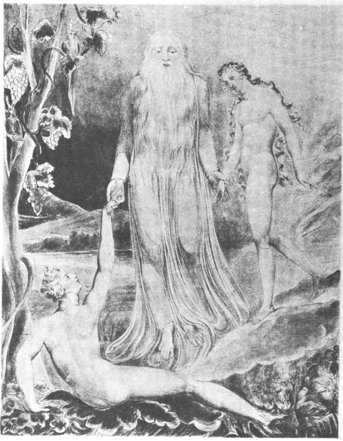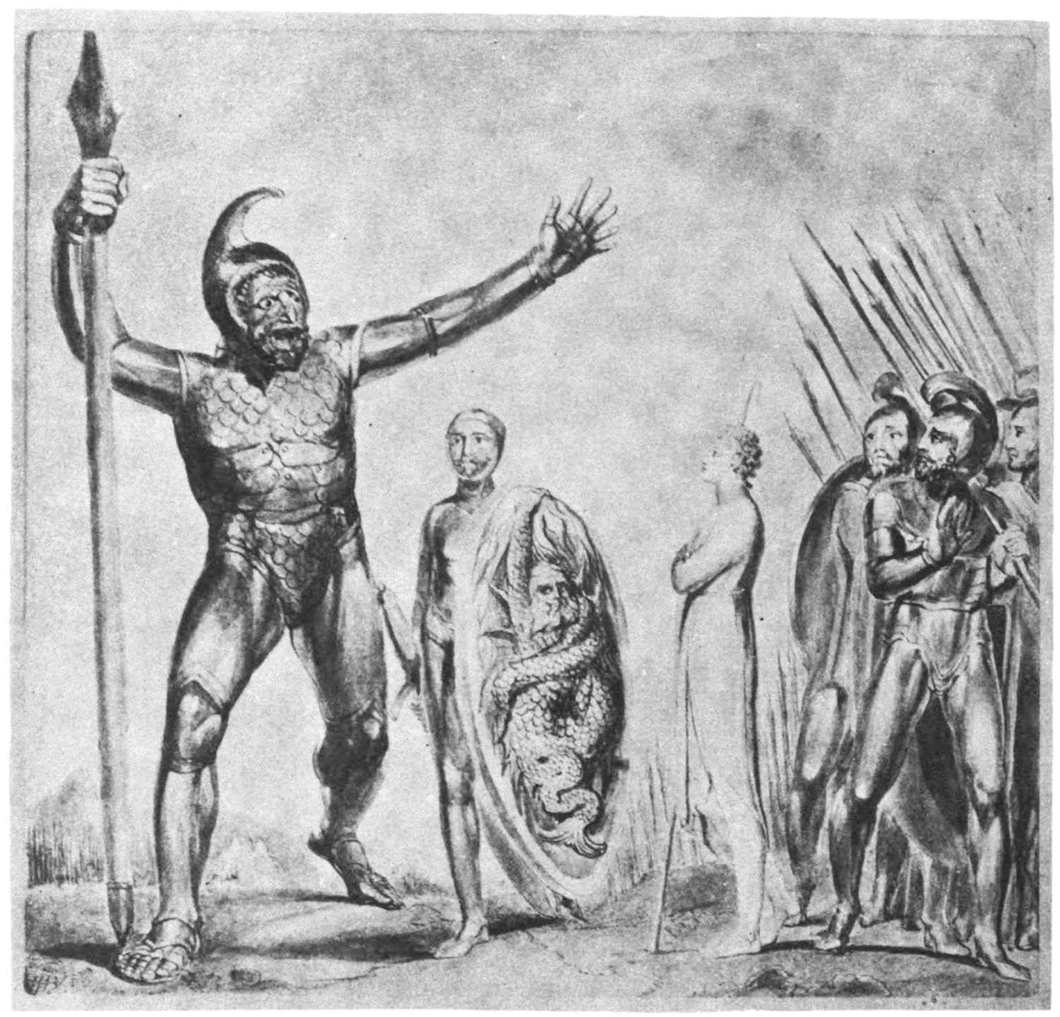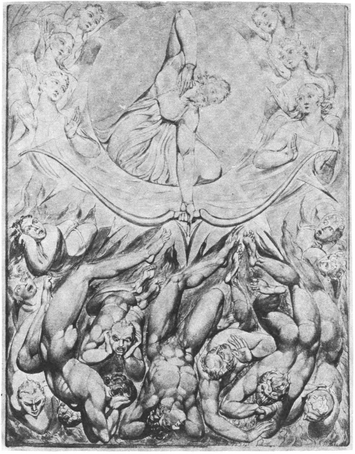 William Blake was born in London in 1757, and in 1827 he departed for “that undiscovered country” which all his life he had wished to see. Throughout the century which has passed since Blake’s death, much has been written about him. During the past few years a goodly number of our greatest men of letters have issued books on his life, art, and writings. Many of his writings have gone through several editions, but it was only within the past year that his complete works were issued, and that in a limited edition, which was soon off the market. While from time to time volumes of reproductions of a part of Blake’s masterly engravings and drawings have been issued, a large portion of his finest creations, including the “Paradise Lost” series, has not been accessible in reproductions.