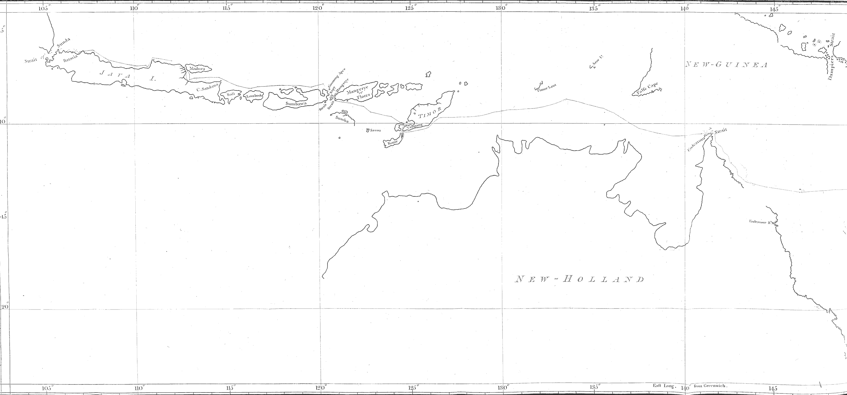 On the 29th of August, I passed by the west end of the Island Flores, through a dangerous strait full of islands and rocks; and, having got into the latitude of 8° S, I steered to the west, passing the islands Sumbawa, Lombock, and Bali, towards Java, which I saw on the 6th of September. I continued my course to the west, through the Straits of Madura.