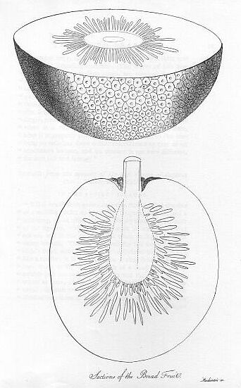 I met at Timor with most of the fruits that are described in Captain Cook's first voyage as natives of Batavia, except the mangosteen. The breadfruit tree, called by the Malays soccoom, likewise grows here with great luxuriance and appears to be as much a native of this island as it is of Otaheite. The fruit is exactly of the same kind but not so good. A breadfruit of Timor weighs half as much more as one of equal size at Otaheite. It is not used here as bread but generally eaten with milk and sugar. At Backennassy I saw about twenty of the trees, larger than any I have seen at Otaheite. Here is also a sort of breadfruit tree that produces seeds not unlike Windsor beans and equally palatable either boiled or roasted. No other part of the fruit is eatable and, though the tree I am told is to all appearance the same as the other, the fruits have but little resemblance, the fruit of this being covered with projecting points nearly half an inch in length.