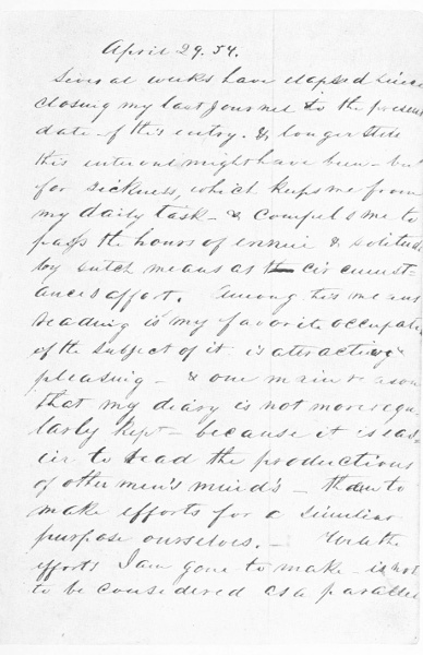 May nineteenth, eighteen fifty-four. I am well once more, enjoying the blessedness derived from such a state. I have just returned after a day's work and having an hour to spare from this to dark I thought to dedicate the same to scrawl down a few lines in these memoirs.