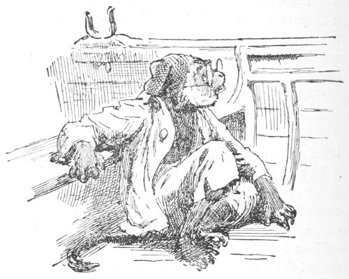 In a few minutes the boat was under the bow, and a strange roar of mingled wonder and laughter came floating aft to us from the crowd on the forecastle. It was a monkey, as the second mate had said—a big ape, with strong white whiskers, which ringed the lower part of his face like wool. He had evidently been some crew’s pet; a small velvet cap with a yellow tassel, like a smoking cap, was secured to his head; he also wore a pair of large spectacles apparently cut out of thin white wood. His body was clothed in a short jacket of some faded reddish material, with a slit behind for the convenience of his tail, the end of which was raw, as though he had been lately breakfasting off it.[240] His legs were cased in their native hair, which was long, something like a goat’s.