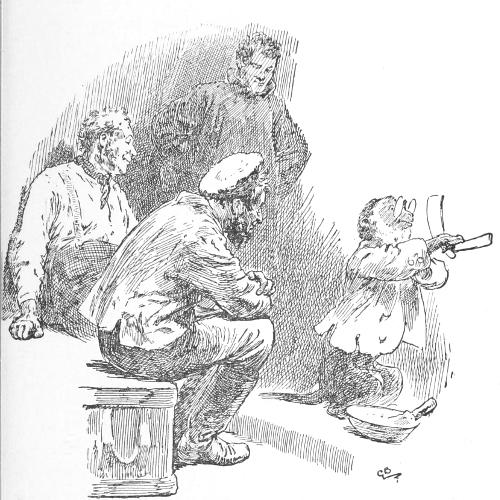 The shipowner, Mr. Duncan, was a large, fat, cheerful man, “with a very knowing eye, and supposed to be already worth, my dear, about a million and a half,” as I afterwards heard my father tell my mother. We passed through an office full of clerks into a little back room, where we were received by Mr. Duncan, who seemed delighted to make our acquaintance. He patted[8] me on the head, said that he was always fond of boys whose hair curled, declared that he could not remember ever having set eyes on a more likely sailorly-looking lad, promised me that I should become the captain of a ship if I worked hard, and then he and my father went to business.