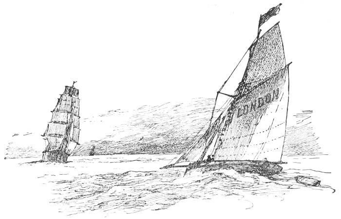 As we approached the entrance to the English Channel ships grew numerous, and every hour yielded us a fresh canvas of ocean panorama. At daybreak one morning we spied a large ship right ahead, and by four o’clock in the afternoon had approached her close enough to read the name upon her stern; and great was our triumph when we discovered that she was the fine clipper ship Owen Glendower, that had left Sydney eight days before us. We passed her in the night, and the watch on deck let fly an ironical cheer at her, taking their chance of being heard, and at sunrise next morning nothing but her royal and topgallant sails were visible on the shining line of the horizon.