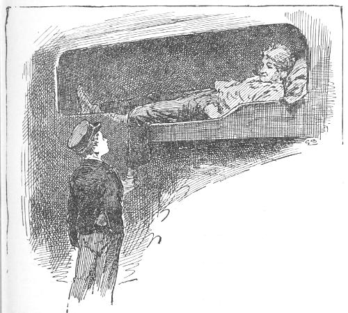 He was carried to the forecastle followed by a[242] crowd of sailors and steerage people, and I lost sight of him, though I hung about, boy-like, for a bit, hoping they would bring him forth presently. However, it seemed that after the seamen had given him a drink of water and a couple of biscuits to eat, they took off his cap and spectacles and put him into a hammock with a blanket up to his throat, where he lay like a human being, rolling a languishing eye round upon those who looked at him, until he fell asleep.