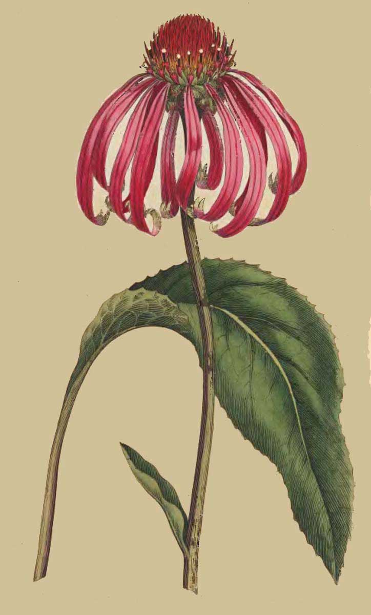 This species differs from the other plants of the genus, in the colour of its outermost petals, which are long, narrow, purple, and pendulous, and not unaptly resemble small pieces of red tape. Notwithstanding it is a native of the warm climates Carolina and Virginia, it succeeds very well with us in an open border: but, as Mr. Miller very justly observes, it will always be prudent to shelter two or three plants under a common hot-bed frame in winter, to preserve the kind, because in very severe winters, those in the open air are sometimes killed. It flowers in July. As it rarely ripens its seeds with us, the only mode of propagating it, is by parting the roots; but in that way the plant does not admit of much increase.