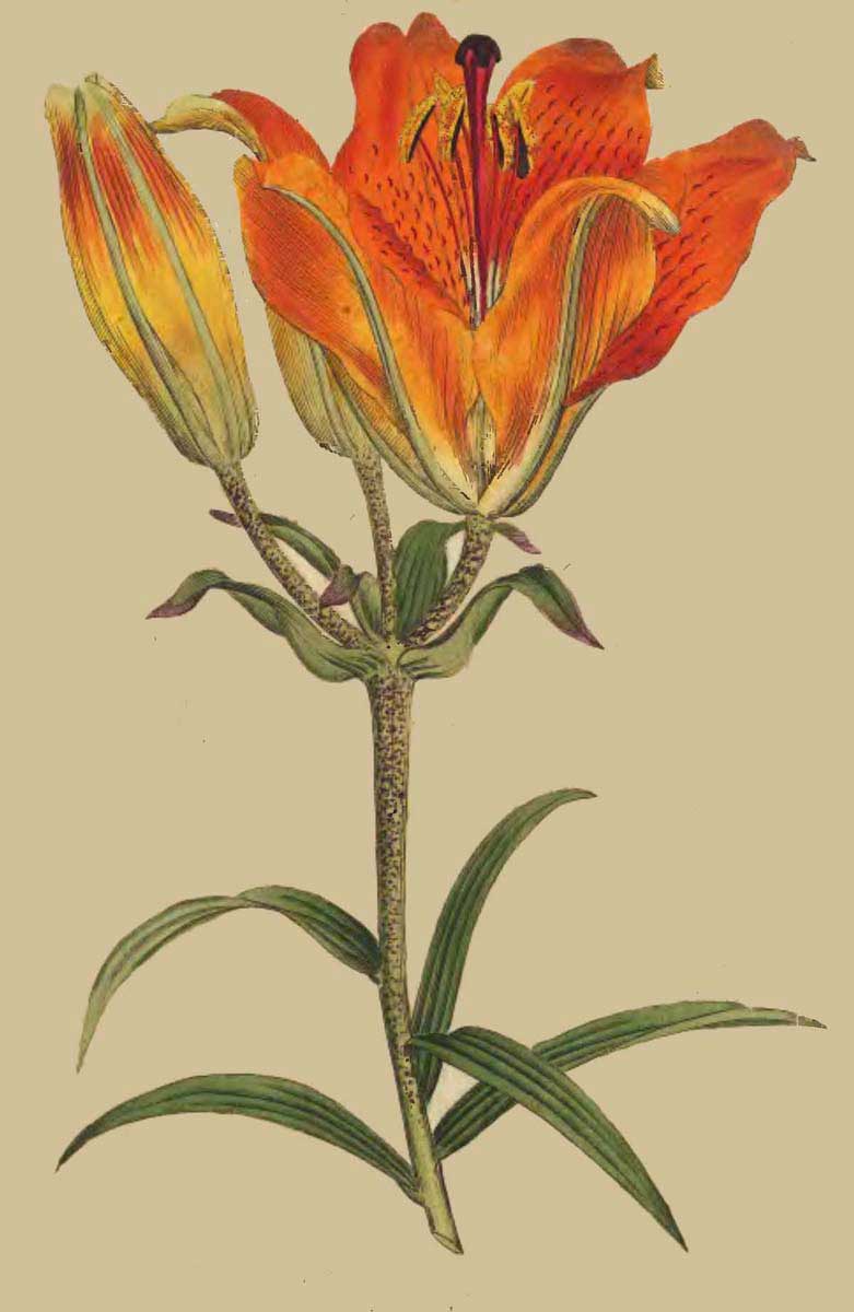 "The common orange or red Lily is as well known in the English gardens as the white Lily, and has been as long cultivated here. This grows naturally in Austria and some parts of Italy. It multiplies very fast by offsets from the roots, and is now so common as almost to be rejected; however, in large gardens these should not be wanting, for they make a good appearance when in flower if they are properly disposed; of this sort there are the following varieties: