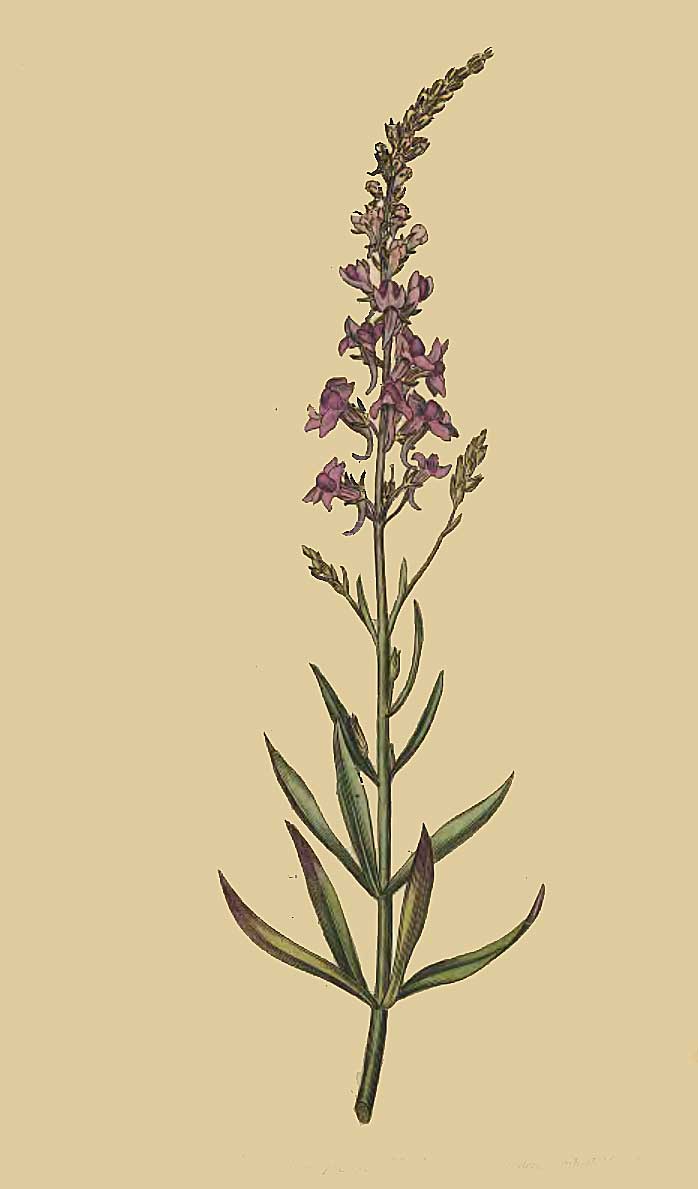 ANTIRRHINUM triste foliis linearibus sparsis inferioribus oppositis nectariis subulatis, floribus sub-sessilibus. Lin. Syst. Vegetab. p. 555.