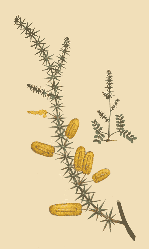 The radical leaves of plants usually differ in shape from those of the stalk, in some plants remarkably so; the Lepidium perfoliatum figured in the Flora Austriaca of Professor Jacquin is a striking instance of this dissimilarity: the Lathyrus Aphaca, a British plant, figured in the Flora Lond. is still more such, as large entire leaf-like stipulæ grow in pairs on the stalk, instead of leaves, while the true leaves next the root, visible when the plant first comes up from seed, are few in number, and those pinnated. The present plant no less admirably illustrates the above remark, the leaves which first appear on the seedling plants being pinnated, as is represented in the small figure on the plate, while those which afterwards come forth grow in whorls. We have observed the same disposition to produce dissimilar leaves in several other species of Mimosa, which have arisen from Botany-Bay seeds, lately introduced.