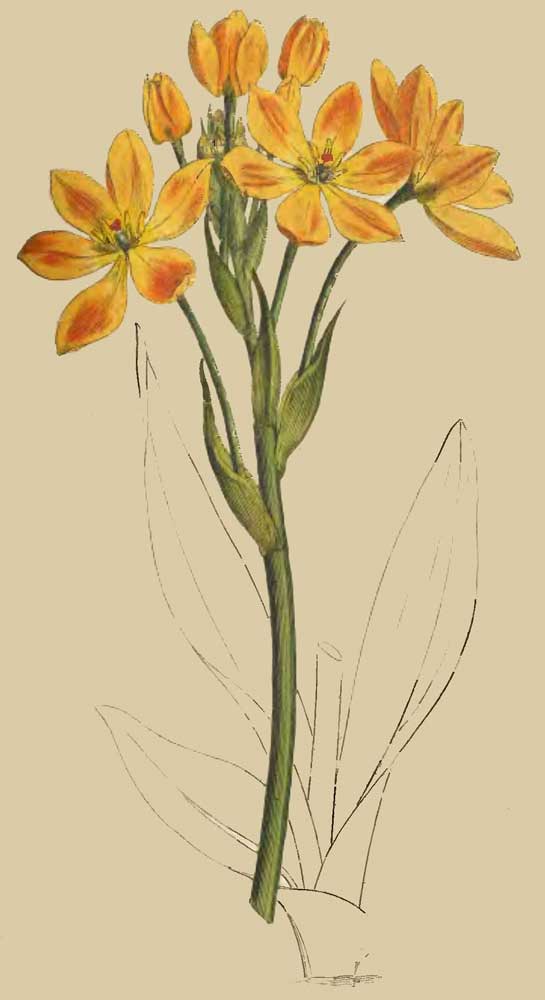 IXIA crocata foliis ensiformibus, floribus secundis corolia basi hyalino-fenestratis. Thunb. Diss. de Ixia. Linn. Syst. Veg. ed. 14. Murr. p. 85.