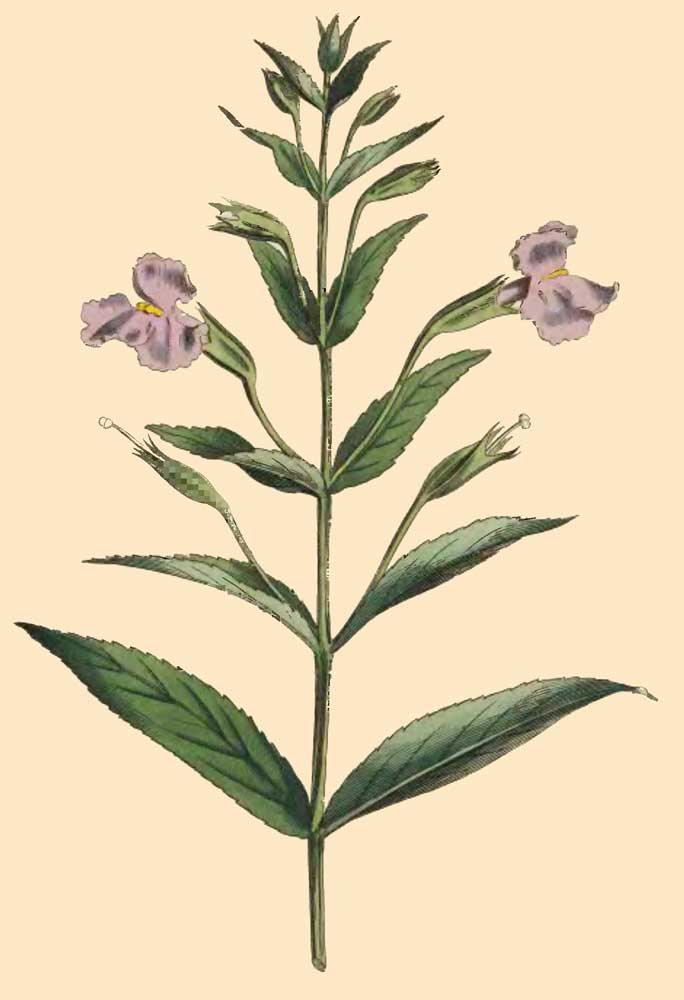 The oldest plant in our possession is about a foot and a half high, much branched, the stalks are round and smooth to the naked eye, green below, above purplish, the leaves are smooth, a deep bright green colour, alternate, standing on footstalks, which gradually widen into the leaves, somewhat ovate, and deeply toothed; the flowers grow in the alæ of the leaves, forming a thin spike, they are sessile, of a pale violet colour, and have a peculiar smell which is rather unpleasant; at the side of each flower are two long narrow Bracteæ; the Calyx, which is placed on the germen, is composed of five short ovate leaves, which appear edged with hairs if magnified; the Corolla is monopetalous, the lower part, which at first is tubular, splits longitudinally above, and forms a kind of half tube, the edges of which are brown, the inside yellow, the outside greenish, the mouth beset with short hairs, each of which is terminated by a small villous head; the limb is deeply divided into five linear segments, spreading out like a hand, and terminated by short points; the Filaments are five in number, of a whitish colour, somewhat broadest above, rather flat, inserted into the receptacle; Antheræ oval, flattened, yellow, bilocular, a little bent, the length of the pistillum; but this is to be understood of such flowers as are not yet fully expanded, in those that are, they are much shorter, and appear withered; the Style, in flowers about to open, the length of the filaments, upright, in those that are opened much longer, and bent somewhat downward; Stigma at first upright, in the form of a cup, having the edge curiously fringed with white hairs, afterwards it closes together, loses its hollow, and assumes a flat appearance, and nods somewhat, the back part of it is bearded; Germen beneath the calyx, oblong, usually abortive with us.