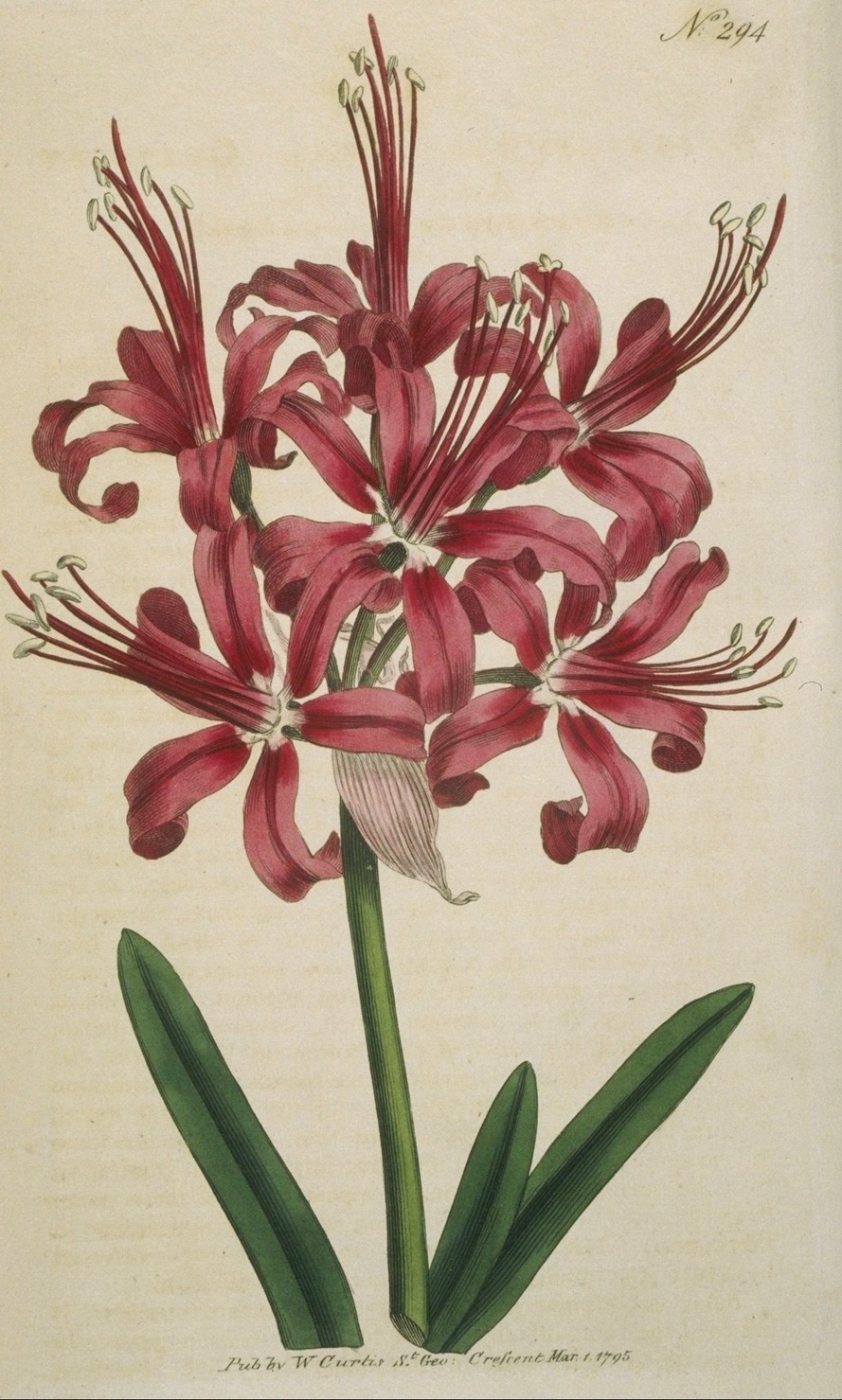 The Guernsey Lily, as it is most commonly called, is originally a native of Japan; where it is described to grow by Kæmpfer and Thunberg, who visited that island, the latter says on the hills about Nagasaki, from thence roots are said to have been introduced to the garden of Johannes Morinus at Paris, in which it flowered, October 1634: its introduction to this country, which was subsequent to that date, as Dr. Douglass relates in his Monographia on this plant, "happened by a very singular melancholy accident, of which Dr. Morison, who no doubt had it from some persons then residing in Guernsey, gives us the following account: A Dutch or English ship, it is uncertain which, coming from Japan, with some of the roots of this flower on board, was cast away on the island of Guernsey; the roots were thrown upon a sandy shore, and so by the force of the winds and waves, were soon buried in sand; there they remained for some years, and afterwards, to the great surprise and admiration of the inhabitants, the flowers appeared in all their pomp and beauty." Some of these soon made their appearance in this country: Mr. Aiton relates, that the plant was cultivated here in 1659, by General Lambert, at Wimbledon.