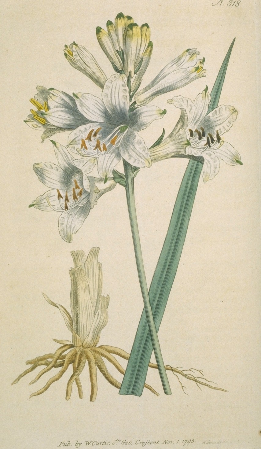 Fatal as Guernsey proved to the unfortunate mariners, it afforded the roots of our plant a soil and situation apparently congenial to their own; in that island they have flourished ever since, there they are propagated in the open borders of the flower-garden with the least possible trouble, flowering most readily, but we believe never producing any ripe seeds; from thence most of the roots which flower with the curious here, are yearly imported in the Autumn.