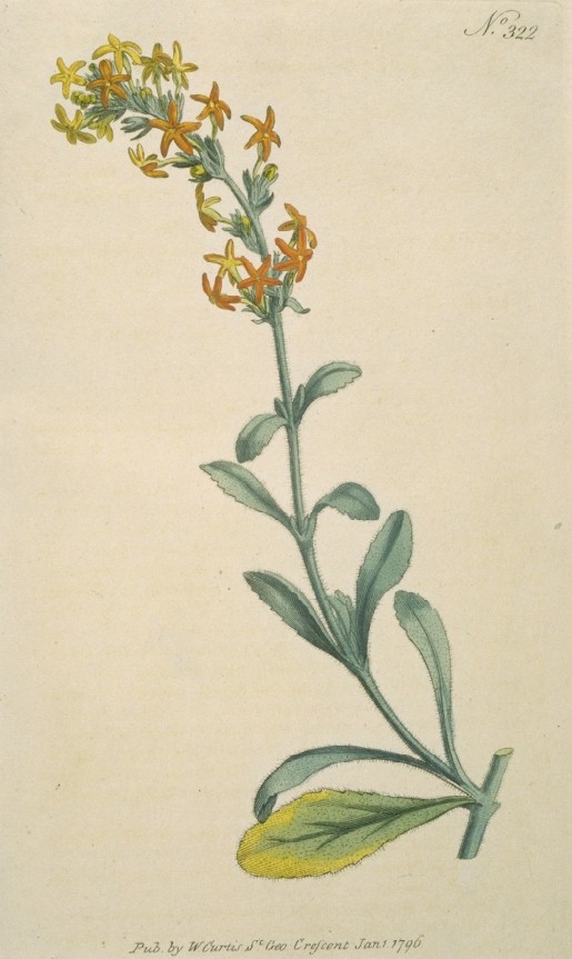 Mr. Aiton regards it as a biennial, its stalk is a foot or a foot and a half high, and woolly, its branches are opposite, not alternate as Linnæus describes them; in this perhaps they may vary; leaves opposite, sessile, obovate, narrowing to the base, toothed on the edge, edge rolled back a little in the young leaves, flowers grow in a long thyrsus, from two to five proceed from one common short peduncle; they are at first lemon-coloured, or greenish yellow, finally deep orange; Linnæus says the whole of the plant except the corolla is woolly, the tube of that even is hairy, the segments are smooth, with their edges rolled back, the upper part of the tube in which the stamina are included is dilated somewhat, as is also the lower part, so that it is narrowest in the middle. The flowers which make their appearance from May to November are usually succeeded by seeds, by which the plant is propagated.