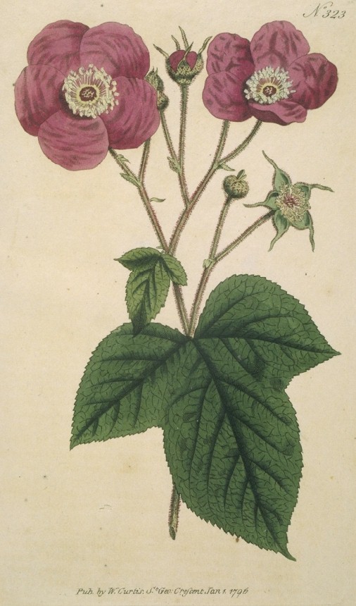 Botanists and Gardeners have given to this species of Rubus the name of flowering, not because it is the only one which produces flowers, but from its being regarded for its flowers merely; they indeed are so shewy, and so plentifully produced, that the plant has long been thought to merit a place in most shrubberies; to the various inhabitants of which, both in the largeness and elegant form of its leaves, and the colour of its blossoms, it forms a pleasing contrast.