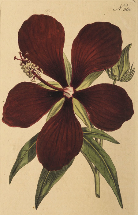 He tells us further, that it is cultivated chiefly for pleasure; that the natives and the Dutch plant it only in the borders of their gardens, in which it does not succeed so well as in pots; and that, if it remains more than two years in the same spot, it degenerates, becomes less woody, and often wholly perishes; that the Chinese, by whom it is held in high estimation, pay great attention to its culture; they set it in pots and jars, and place it before the windows of their apartments, and that it is not unusual for them when they invite their friends to an entertainment to decorate their tables with it; on those occasions, he that produces the largest flower, is considered as conferring the greatest honour on his guests; besides these three varieties already mentioned, they have a fourth, which is more rare,[9] whose flowers are of a greenish ash colour (is not this the var. figured in the Hort. Malab.?) all these varieties growing in separate pots, they place in certain quarters which they particularly wish to decorate, and the effect they produce is highly pleasing: in the cultivation of this plant they spare no pains, the shorter it is and the larger its flowers, the more it is esteemed; to make it dwarfish, and at the same time productive of flowers, they check its growth; for, if suffered to grow rude, it assumes a wild nature, and produces little but leaves when it is coming into flower, of the three blossoms which usually terminate each branch, they pluck off two, and thus the remaining flower grows larger; by this, and other management, they cause the flowers to grow to the breadth of one's hand: he enumerates still a fifth sort with white flowers, which is extremely rare, and smaller than the others, called Tsehuy say si, that is the drunken woman; its flowers morning and evening flag, and hang down as if debilitated by intoxication, in the middle of the day they become erect, and follow the course of the sun; but this (most probably a distinct species) is not exported from China. Finally, he remarks, that the Chinese and Malays are so attached to these flowers, that they even decorate their hair with them.