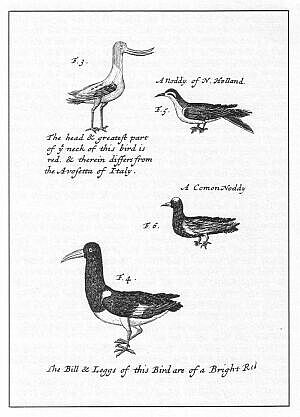 FIGURE 3: THE HEAD AND GREATEST PART OF THE NECK OF THIS BIRD IS RED AND THEREIN DIFFERS FROM THE AVOFETTA OF ITALY. FIGURE 4: THE BILL AND LEGS OF THIS BIRD ARE OF A BRIGHT RED. FIGURE 5: A NODDY OF NEW HOLLAND. FIGURE 6: A COMMON NODDY.